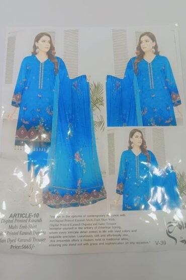 ARTTICLE 10 DIGITAL PRINTED KARANDI MULTI EMB SHIRT WITH DIGITAL PRINTED KARANDI DUPATTAAND PLAIN DYED KARANDI TROUSER