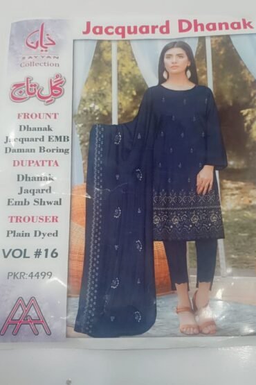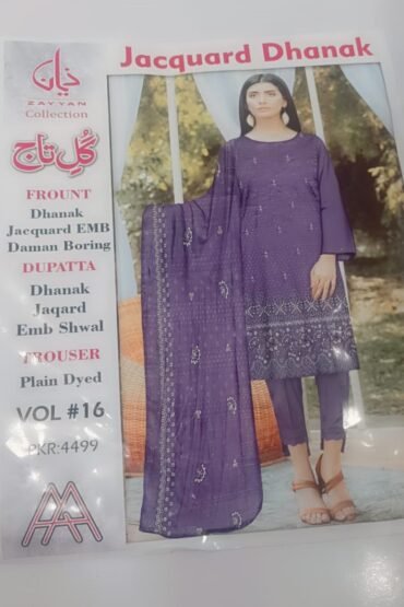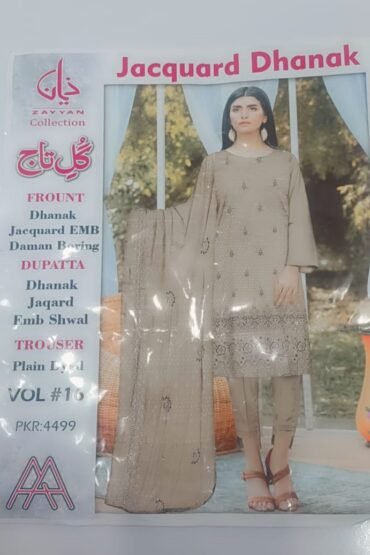 JACQUARD DHANAK (GUL TAJ) DHANAK JACQUARD EMB DAMAN BORING WITH DHANAK JAQARD EMB SHWAL AND PLAIN DYED TROUSER