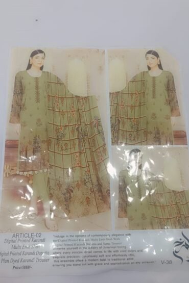 ARTICLE-02 DIGITAL PRINT KARANDI MULTI EMB SHIRT WITH DIGITAL PRINTED KARANDI DUPATA AND PALIN DUED TROUSER